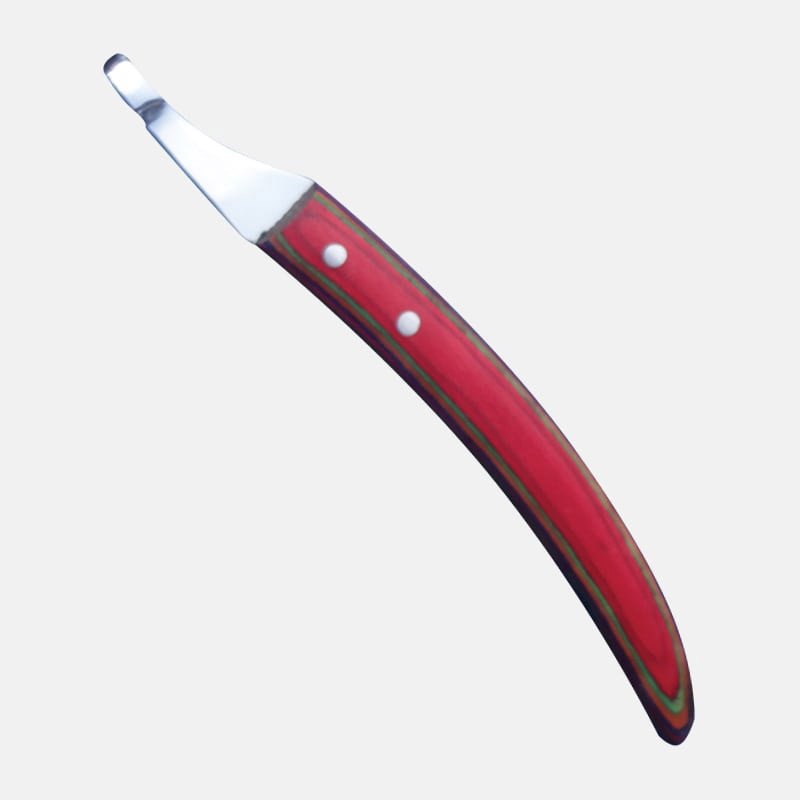 Loop Blade Knife has been designed with a long handle to give extra cutting power for working on even the hardest feet. The blade is made from A2 tool steel and hardened to 55 Rockwell. This knife is ideally suited for symmetrical trimming of frogs