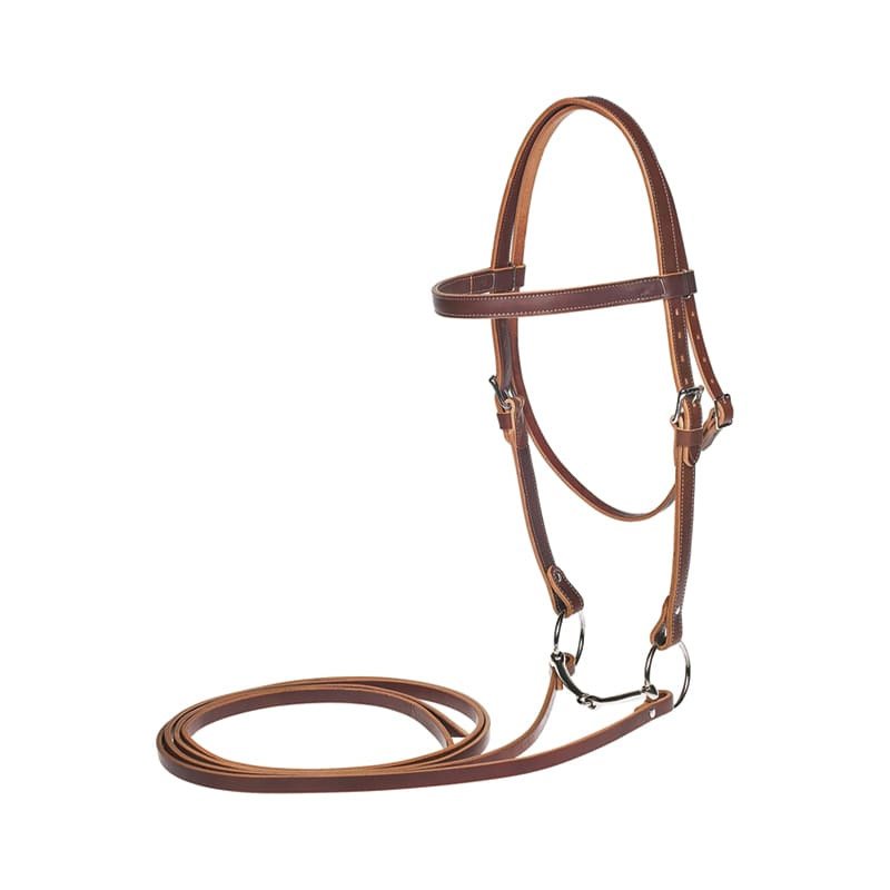 Description: The Fancy Stitch Snaffle Bridle Bridle is beautiful, traditional, and economical. Finely crafted with durability and versatility in mind, the Advantage bridle is made to last and be a staple in your tack trunk. This bridle features white detail stitching on the nose and brow bands. Made from quality, imported leather and stainless steel hardware. Complete with laced reins, this bridle is ready to be used! Dimensions: 5/8″ nose and brow band, 1/2″ cheek pieces, 5/8″ laced reins